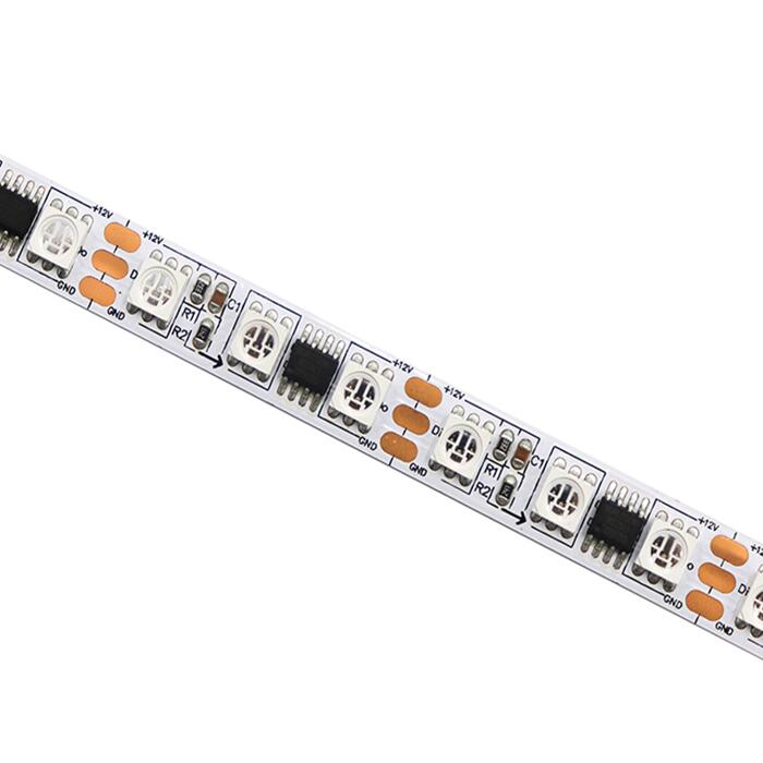 1.This addressable led strip consist of 5 meters in a reel,84 pcs RGB led per meter, three leds one group, and each group with a WS2811 IC.